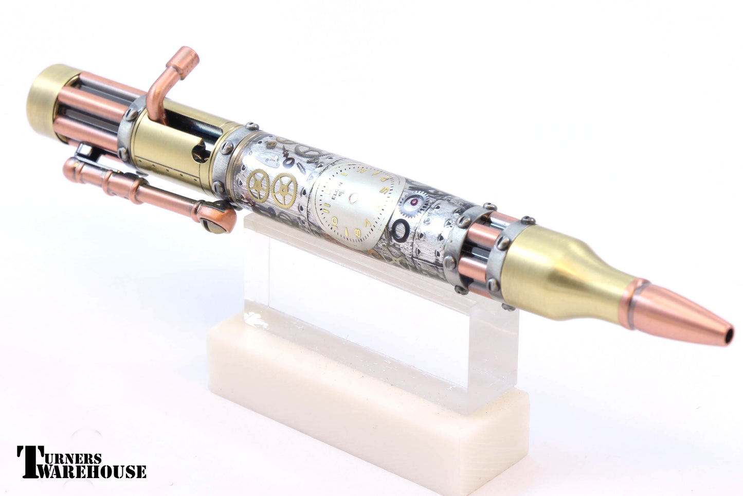 This pen combines style and function with its gatling gun inspired bolt action design. Constructed with precision and attention to detail, this pen is the perfect accessory for any writer or enthusiast. Experience a unique and effortless writing experience with this one-of-a-kind pen.